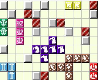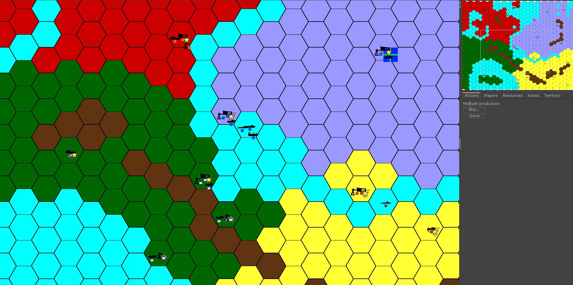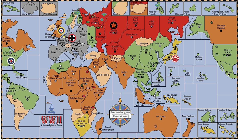 Axis and Allies is now a series of games, but this implementation is of the classic game covering the whole of WW II. In this game Germany (grey) is still hanging on to the European territories it's invaded, but Japan (yellow) is on the ropes after the US (green) focuses on the Pacific taking most of the Japanese conquests and keeping China a US ally. The US has also made tech breakthroughs (the game allows players to gain tech advances in different weapons systems) gaining Heavy Bombers (akin to nuclear bombing ability). England (brown) has done a good job hanging onto Africa with help from Russian (red) tanks despite Japan's attempt to take more territory from South Africa.