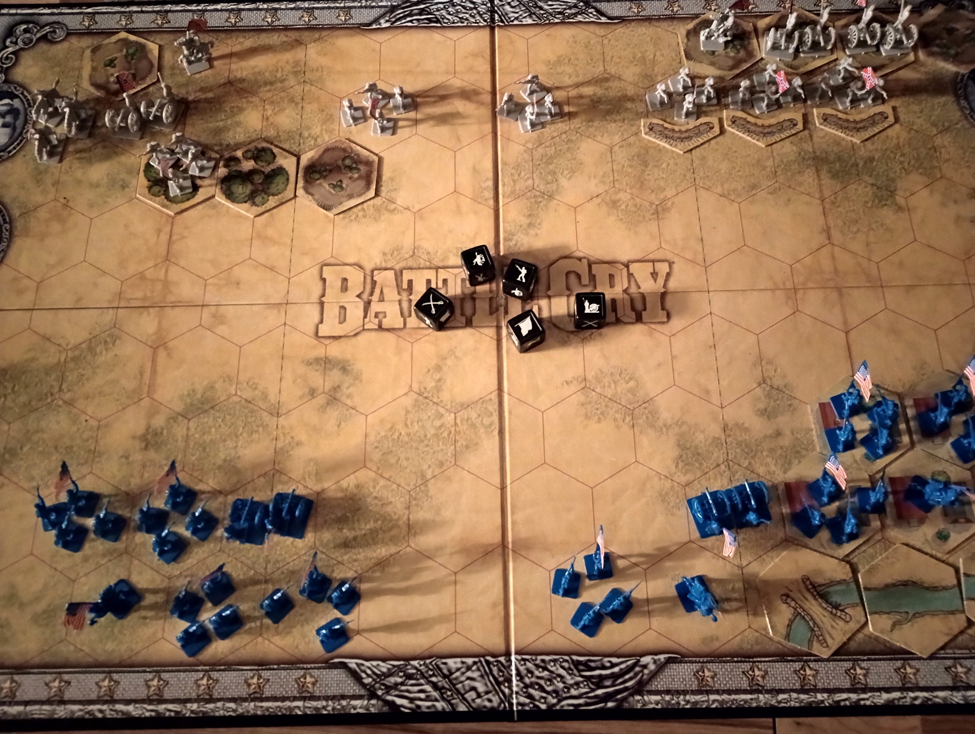 Battle Cry is a game about American Civil War battles - it uses a kind of command card driven system where players take turns playing cards from their hand that may allow them to do an action on only one part of the board - left, middle or right - or may allow them to do actions on multiple parts of the field. To represent historical differences in commanders of a particular battle, that battle may allow one side to hold more cards in their hand at a time (so more action possibilities to choose from each turn). For example in a battle where one of the best commanders Lee is facing a not so good general, the player with Lee may get 5 cards at a time while the other gets 3 or 4 cards. The pic is the set up for the battle of Fredericksburg where Lee and the Confederates are at the top in grey, and Burnside and the Union troops are in blue at the bottom. Burnside had hesitated taking too long to cross that river into town, so Lee was able to occupy the high ground and best defensive positions looking over the town. Here Lee player gets 5 cards and Burnside player only 3. This is one of 16 battles in the game all using the same base board with the tiles placed in different configurations on the board to represent each battlefield.