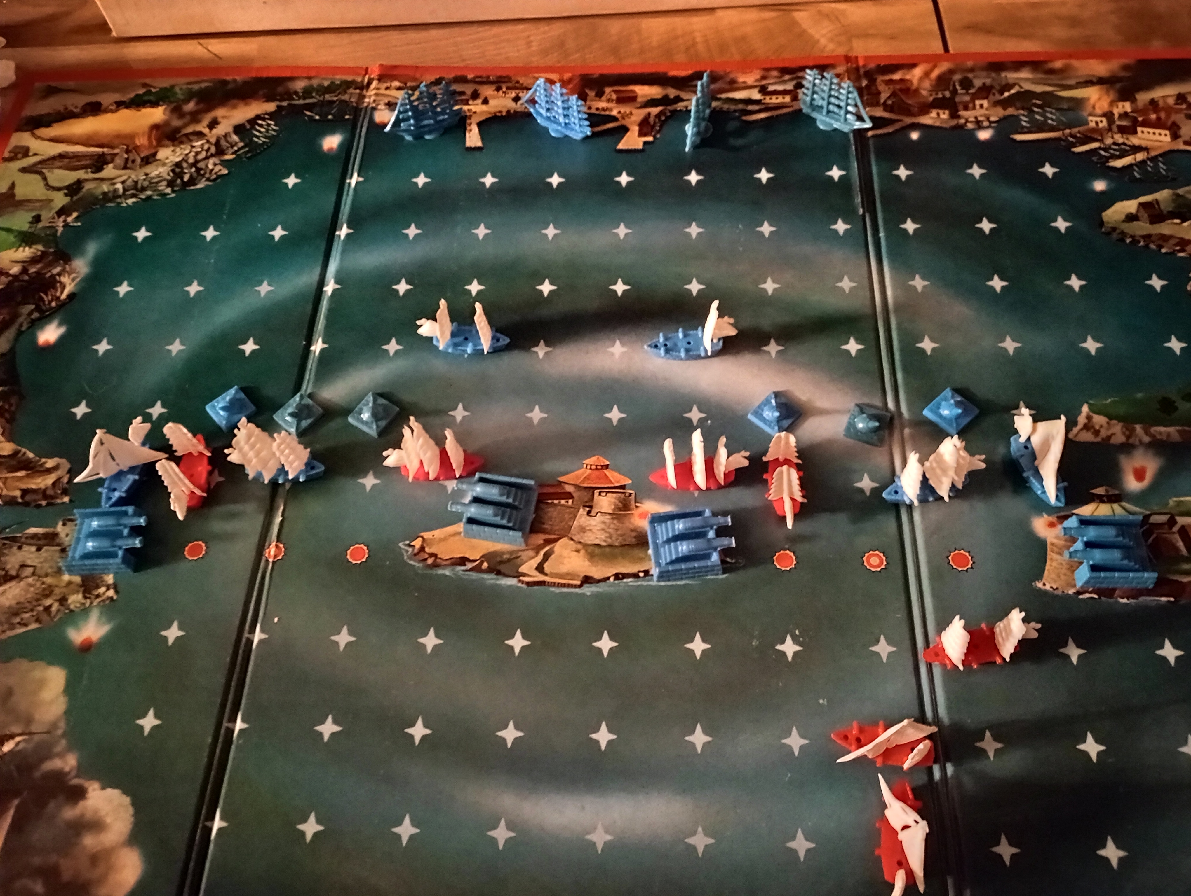 Broadside came out in the early 1960s as part of Milton Bradley's American Heritage series (Dogfight was another good one in this series). This was my favorite of this series. It was not about a specific historical battle but represented the War of 1812 naval fighting on the Great Lakes. I liked that it played pretty simply but represented well the term broadside and 'crossing the T' in the era of wooden ships naval battles. Broadside meant firing on another ship with the side of your ship facing them to bring to bear most of your guns which would be lined up along the sides of your ship. 'Crossing the T' referred to when you could get a broadside position on your opponent, but one of the ends of his ship was facing yours so that he couldn't return nearly as much fire. In the pic you can see the ships are red for Brits and blue for Americans, and have white sails. Each time a ship takes a hit from another, a white sail is removed sinking on the loss of its last sail. So the Brits start with stronger ships having more sails to start with, but they must get through the blue barriers - shore batteries and bouys which may either cause a hit or sink one of their ships - and defeat the blue ships to get to the back of the port to sink the defensless merchant ships there. The blue ships have to protect the merchant ships and destroy the red ships. In the decades since this game came out, gamers have been known to use the ships and sails to design other games of famous naval battles of the wooden ship era.