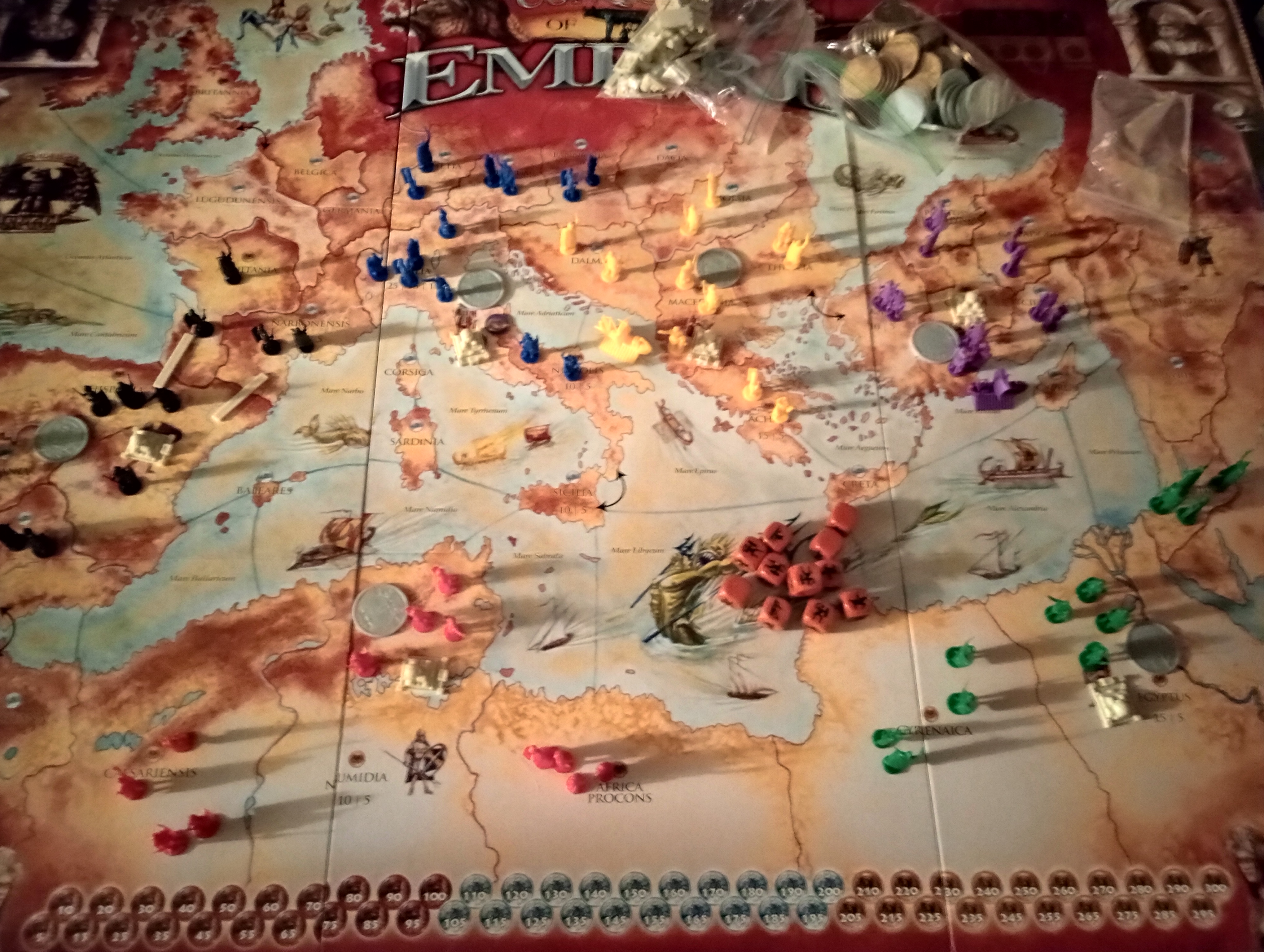 Back to a TripleA map, this one covers the time of the rise of the Roman and Carthaginian empires amidst the other empires of the Mediterranean. Rome and Cartage were directly across the sea from each other so while they were taking over other states around that sea, they had to keep an eye on each other in anticipation of the three Punic Wars they would eventually wage.