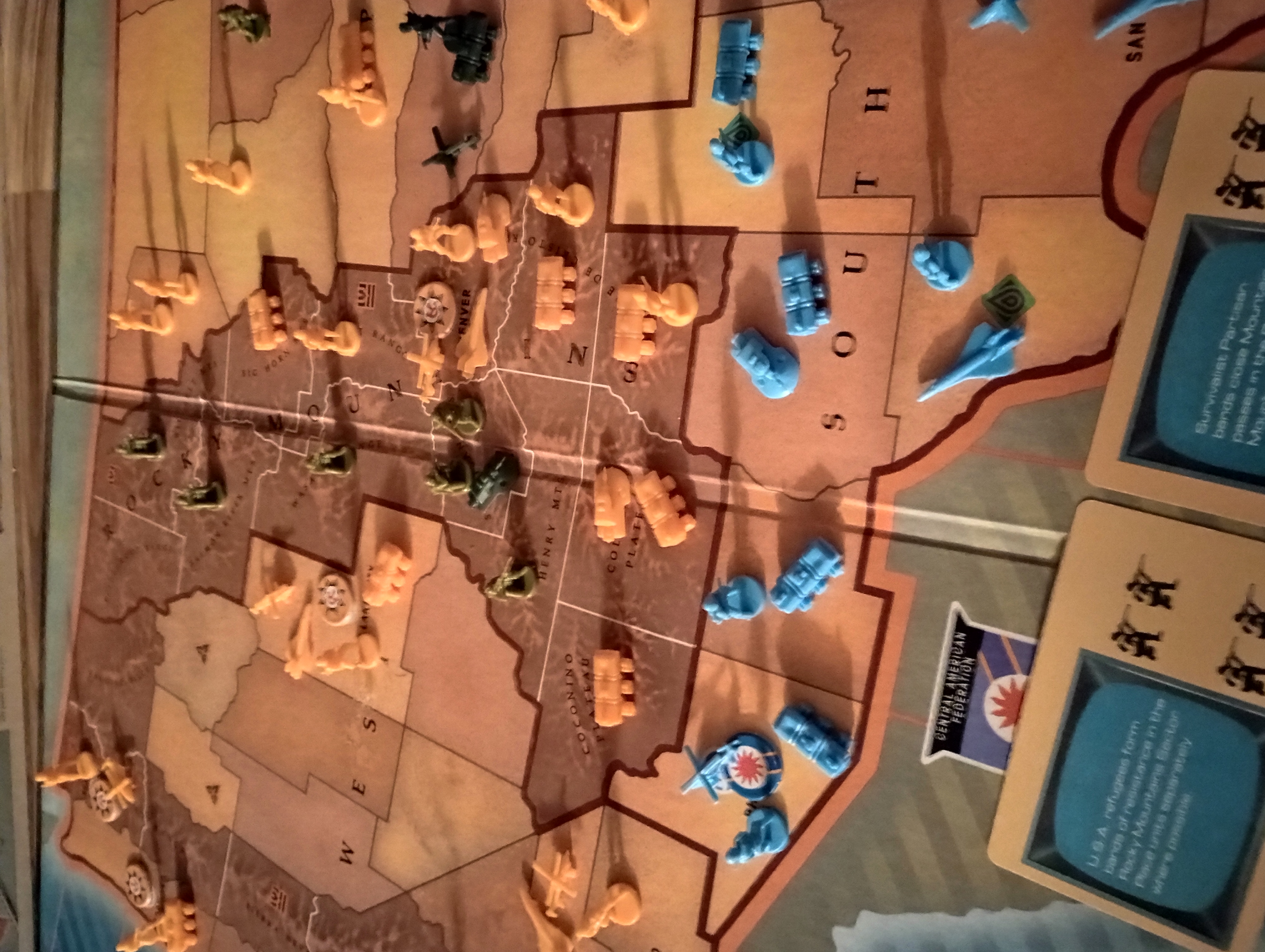 Second only to Axis and Allies, Fortress America was probably the most popular of the GameMaster series. This was due to popular movies of the era (Red Dawn, etc.), and having futuristic units - hovertanks, lasers, etc. And the game is really fun to play. It works well with 2-4 players, US player vs 1-3 people playing the invaders - Euro-Socialist reds (Russia having conquered Europe like in Red Dawn) hitting the east coast, Central American blues invading from Mexico, and Asian yellows attacking the Pacific coast (US Navy has been destroyed..). The US while badly outnumbered and surrounded get a few fun to play advantages - a number of space satellites that can hit any enemy unit anywhere (add another laser to the number each turn), and my favorite Partisan cards! Each turn the US draws two cards that each have an action taken by partisans behind invader lines (like Wolverines in Red Dawn). These vary in strength and what regions they spring up in, but typically have the potential to do great damage to the invaders. In the pic I took a close up of the western region when the US drew two particularly good cards because they can coordinate to good effect. There's a grouping of partisans - two troops and tank - in the San Juan Mountains that can cut off the Asian forces in the just taken Denver, and the other card has individual partians arising in the nearby mountains to possibly cut off Asian attempts to reinforce Denver. If the invaders lose their line of supply and can't restore it, they lose those forces there!
