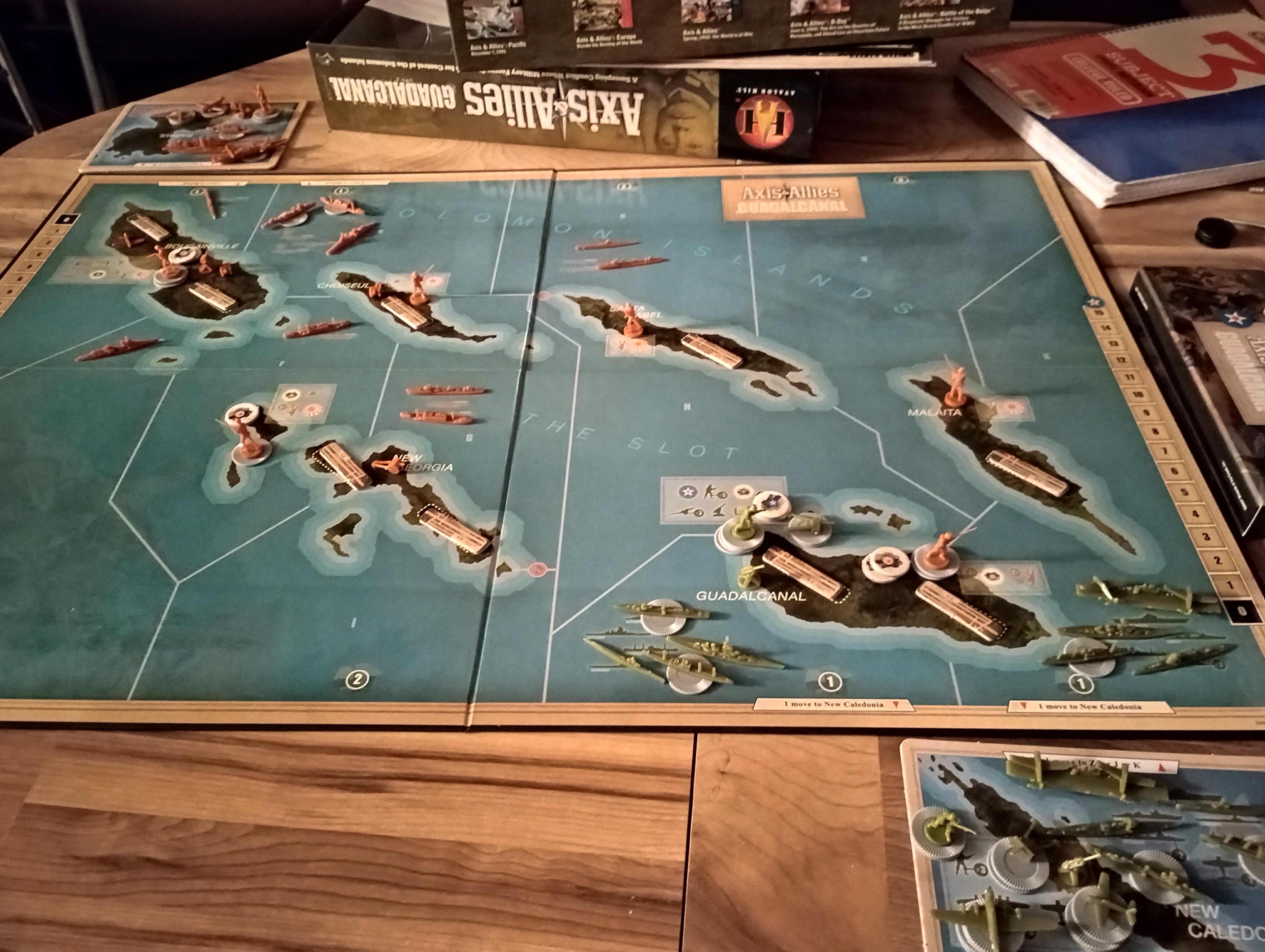 The original Axis and Allies came along about the early 1980s and covered the entire worldwide WW II. Since then different companies have come out with many different variants for it - versions with just the European or Pacific theatre, AA Bulge, AA Normandy, even an AA 1914 for WW I. One of my favorites is AA Guadalcanal as the tight naval and air action in it is really good. The pic is the starting positions with the little cards on the sides as each side's closest major base not on the map where new units will be coming in from. You can see the waterway in the middle is labeled 'The Slot' where constant close range and night fighting occurred including five major naval battles - much of this occurring in the waters close to Guadalcanal which became nicknamed Iron Bottom Sound due to all the wrecked ships sunk to the bottom there.