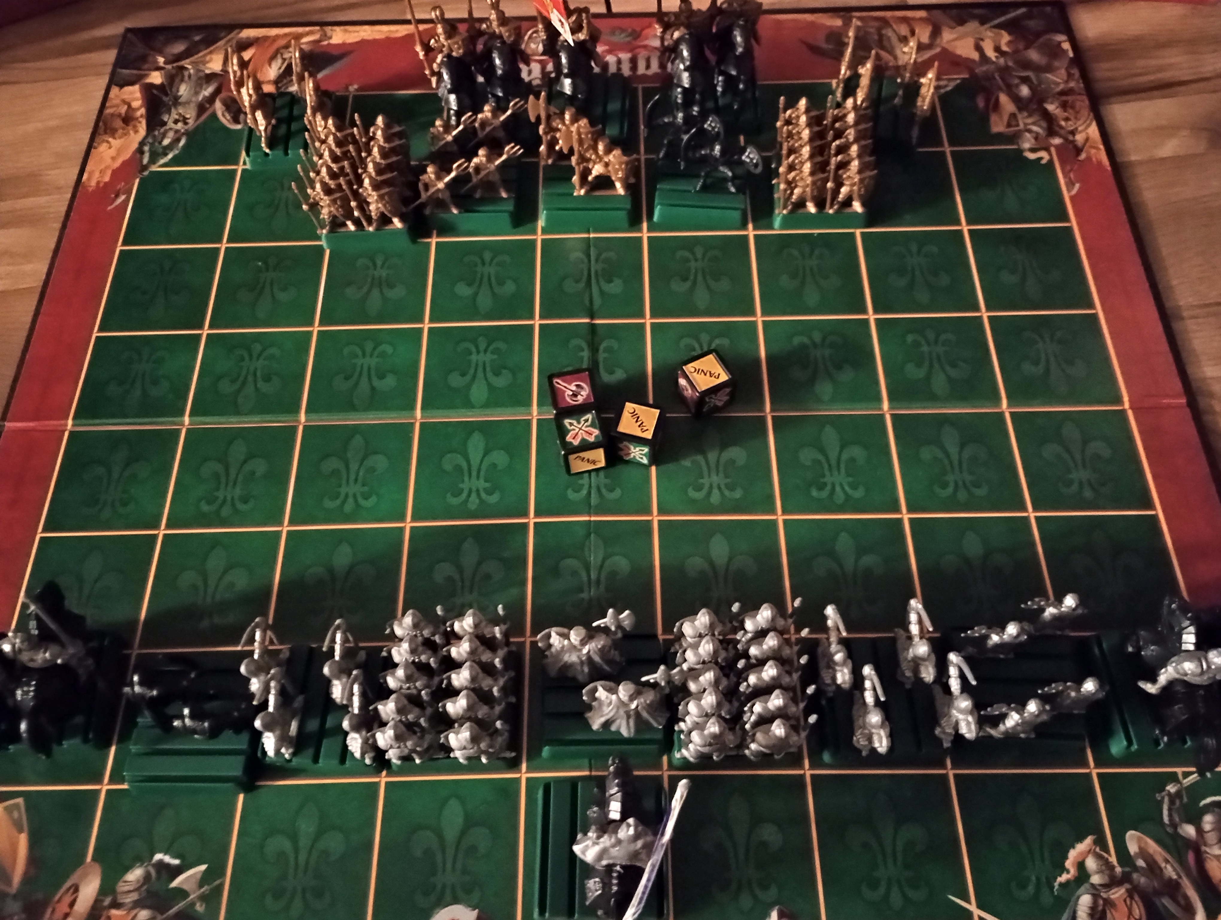 Lionheart is an interesting combination of a chess-like game with miniatures. It is very customizable to however you want to play it. There are a good variety of units - some bases with many basic infantry, some with a couple of heavy infantry, some with archers, horse knights, peasants with pitchforks, mercenaries, etc. It can be a completely customizable set-up - generally the Kings start on their center back square, but for the rest, the cardboard box top is set between the players as a blind, and both players can set up the rest in secret anywhere on their first two rows. The turns are interesting too in that on your turn you can take any combination of two actions with units (can do this with the same or two separate units) - move in the direction they are currently facing, turn to another direction, and attack.