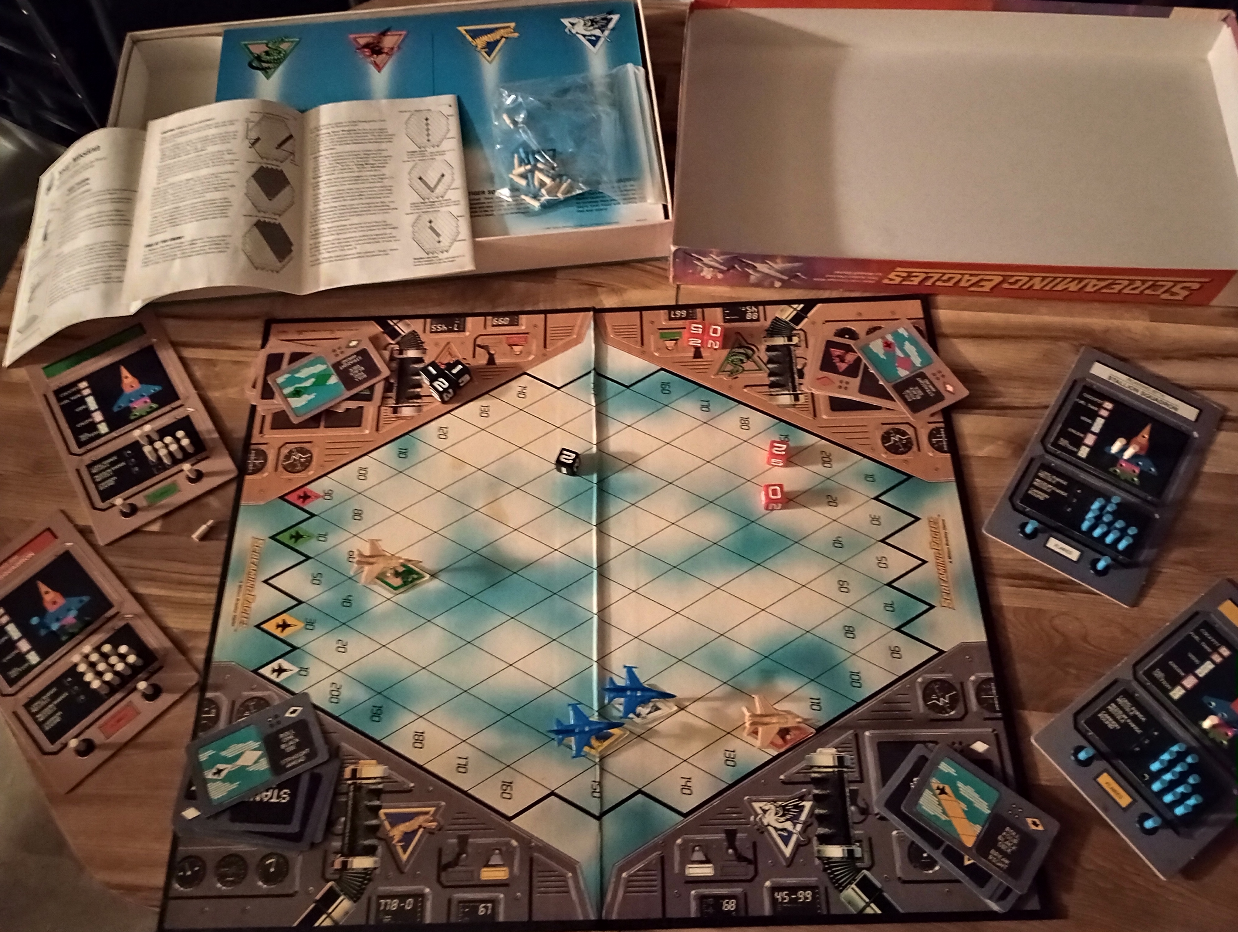 This was a fun game of 'modern' (1987) air combat between two pairs of jet fighters. The vast range of movement was handled by a kind of wrap around board - since looping is common in air combat, whenever a plane goes off the board, it comes back around the other side in a corresponding numbered space. Each plane has it's peg board to keep track of how many missiles and cannon ammo it has left and what hits it takes with any section of the plane being completely hit bringing the plane down. In this game the yellow planes were getting more hits on the blue planes early on, but the blue player was able to manuever both his planes behind one of the yellow ones and was fortunate to get multiple hits in the same plane section (tail) taking it down.