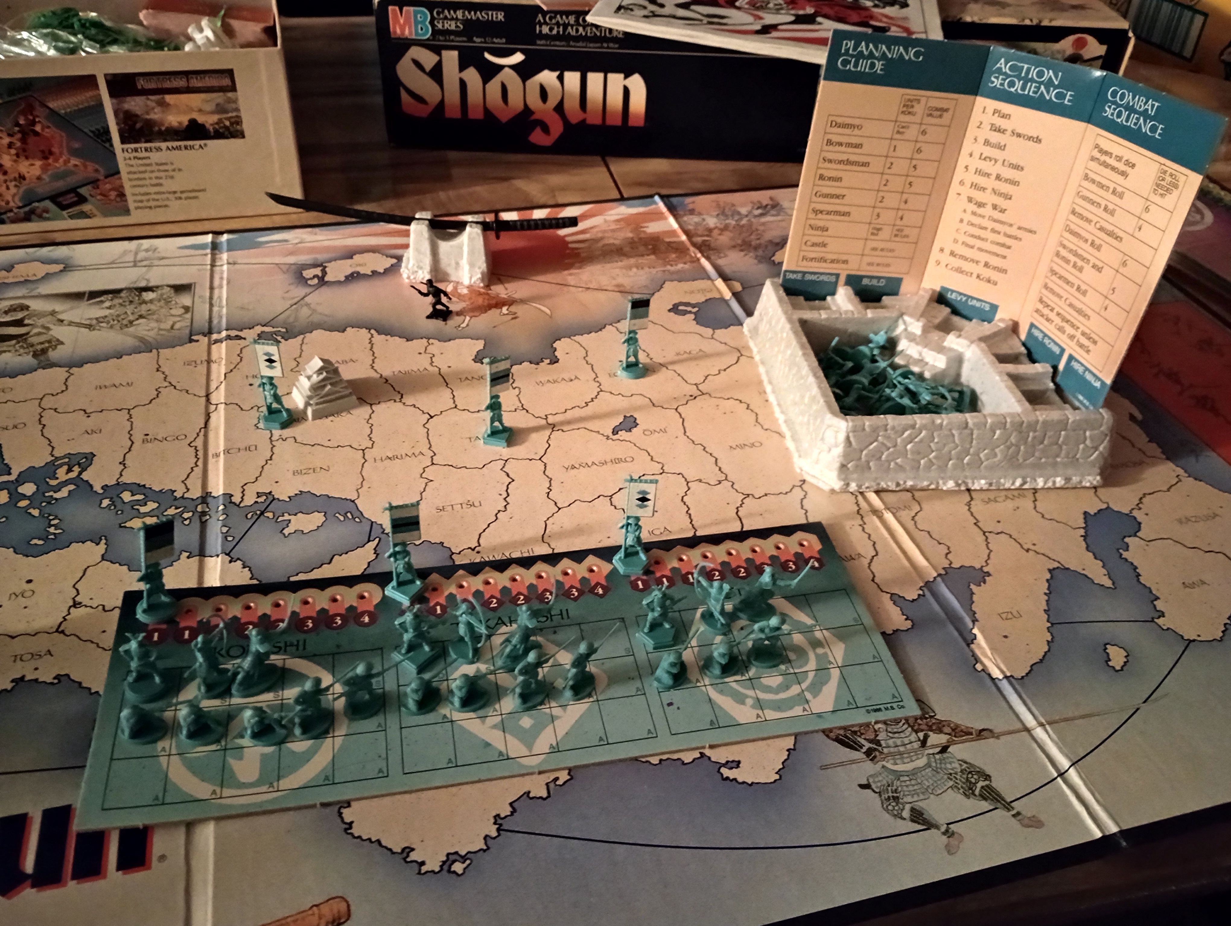 Note: the link will go to a later version called Ikusa/Samurai Swords - same game. Shogun was another popular game in the Game Master series. It was a favorite of some because it has Samurai, Ninja, etc. Due to the fact that it had a lot of hidden information, I tried to get a pic showing the parts to explain how they worked together rather than an in-game pic. But like the other Dudes-on-a-Map games, a game would have plastic minifigs across the map holding territories, doing battles, etc. But while there were smaller individual units on the map the larger armies were represented by their flag-bearers on the board. Each player had three main armies consisting of varieties of numbers and types of pieces. On the pic you can see the three armies for blue on their cards, while their flag-bearers are on their positions on the map, one by the player's castle. You can also see a vital area of hidden information in the screened box to the right. Each turn in the five slots a player would put resource chips according to where they wanted to emphasize - building units, 'taking swords' which is where the players could bid for their turn order (not going first may be preferrable for instance), and bidding to hire the ninja for an assassination attempt, or hiring ronin (professional mercenaries).