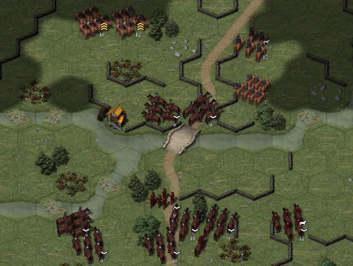 Another Steam game, this one is on battles from the English Civil War with Parliamentarians versus Royals. The scenario in play in the pic is the battle of Powick bridge where both sides were scrambling to gather allies and forces for their cause. The Parliamentarians coming from the bottom were able to initially cross the bridge and push the Royals back, but then the Royals were able to gather themselves and turn back on the Parliamentarians doing them too much damage for them to have a clear victory.