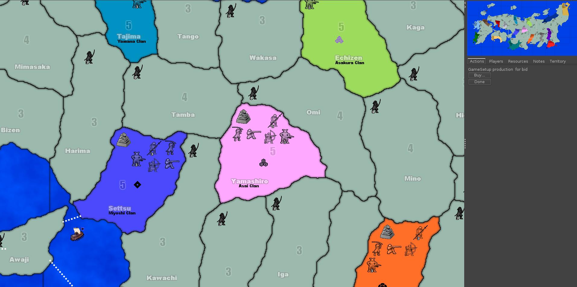 Another TripleA map that takes from one of series of the games Axis and Allies was part of - The GameMaster series - this one is as the title states on feudal era Japan and is very similar to the GameMaster game Shogun. There are a couple of TripleA maps on this subject. It involves shogunates, Samurai, ships, castles, and sometimes even gun firepower units!