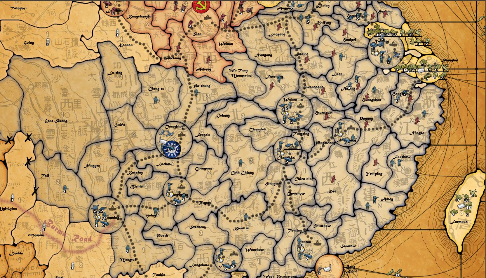 This is an interesting TripleA map in that while it's WW II (well, 1938..) era the subject is not a typical AA one. This covers the actually multi-way struggle for China with Japan invading against the other sides, but the other sides also fighting for control of China when it's all over - the communist Chinese in the north, the nationalist Chinese in the center, and even outsiders such as Indochina and Brits are sides in the game.