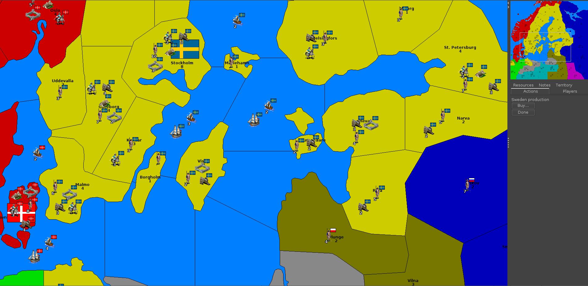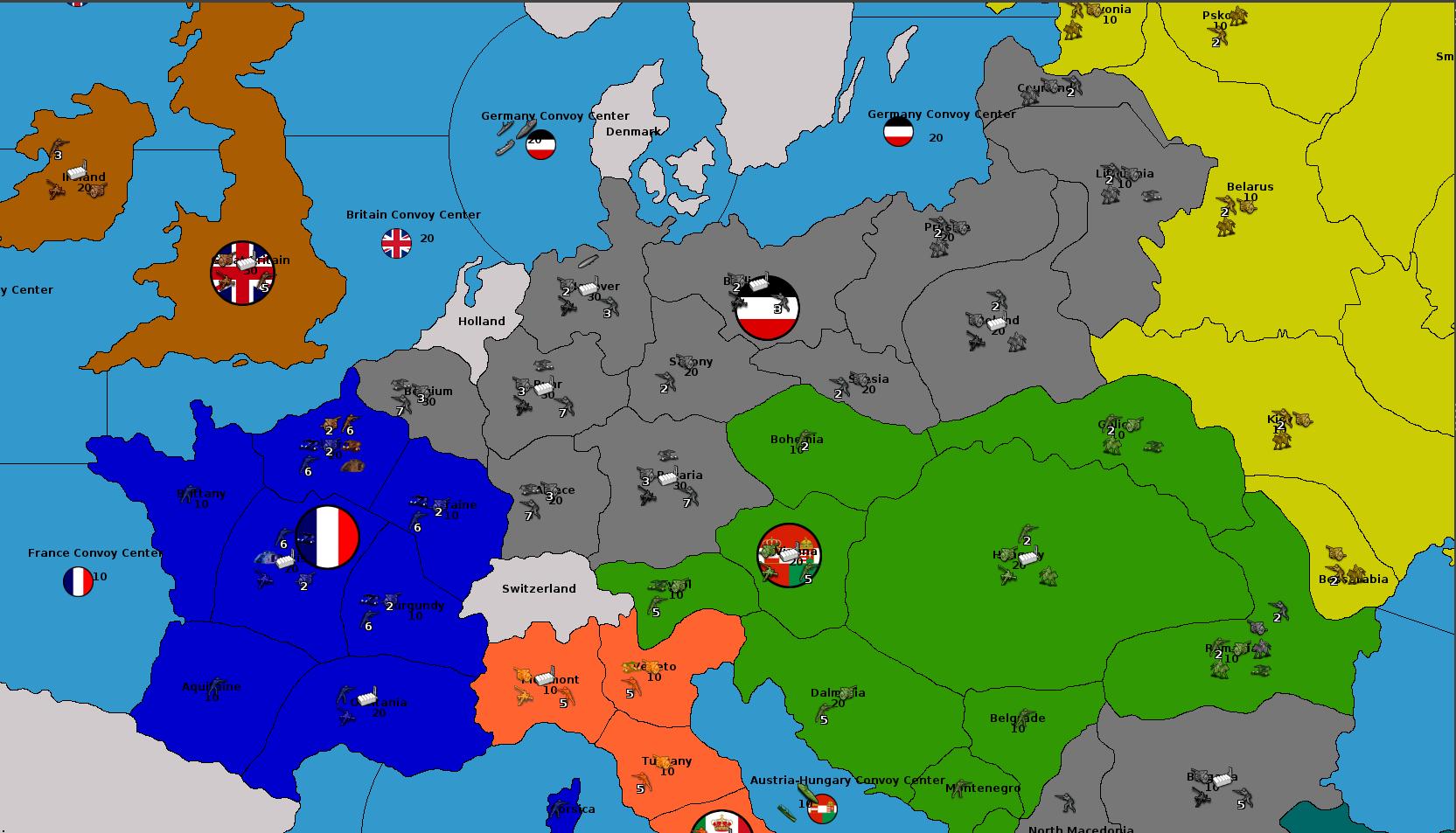 Another TripleA map, this is one of my favorite to play because it can really go in many directions. Historically it occurred when Sweden was a dominant power in northeastern Europe, and the others in the area were allying against it. Sweden had a string of victories over these allies until defeated at the battle of Poltava in 1709 by Peter the Great. This ended with the loss of both Sweden's main army and it's main commander as well as territories ceded to Russia, thus leaving Russia the dominant power in the area. Peter was well known for modernizing a number of areas of Russia (military, etc) and gaining access from this battle to ports on the Baltic with which to become much more involved in European affairs and trade.
