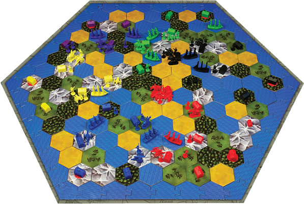 This game combines the replayability of having a new map every time in the same manner as Settlers of Catan while having the strategy and interest of an Axis and Allies game with Napoleonic era pieces. While it may not be that well known, it has grown a following across the world so that there is a tournament every year. The first pic is with a long time opponent who has gotten better to the point where he ranked in the most recent tourney! The second is the end of a multiplayer game - the game can be scaled from a few hexes across to many to accomodate up to 8 players. The third pic is one of a smaller board where an interesting map arose with sea hexes going most of the way up through the middle making naval units very important! Many interesting maps come from this system of discovering it anew each game.