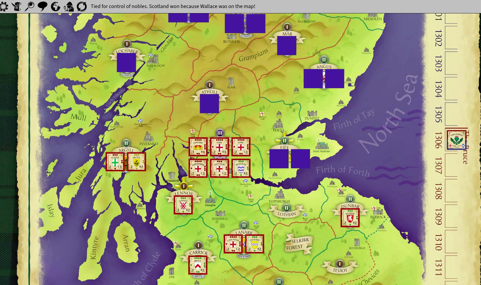 I was fortunate to find a good opponent for the Rally the Troops site. We've played a few different games on there, Hammer of the Scots most frequently. This is a 'block game' where you see the face of your blocks but only the blank backs of your opponents. In this game, we were even on the nobles count (victory determined by this) but a tie would go to my opponent as he still had Wallace on the map. So my only chance was building up forces to try to hit a weak spot which I tried to set up to do on the last play of the turn hoping to turn a noble to my side at the very end. But my opponent had drawn the Truce card which prevents attacks, so he just waited to play that on the last play. Which just goes to show 'the truce hurts'.