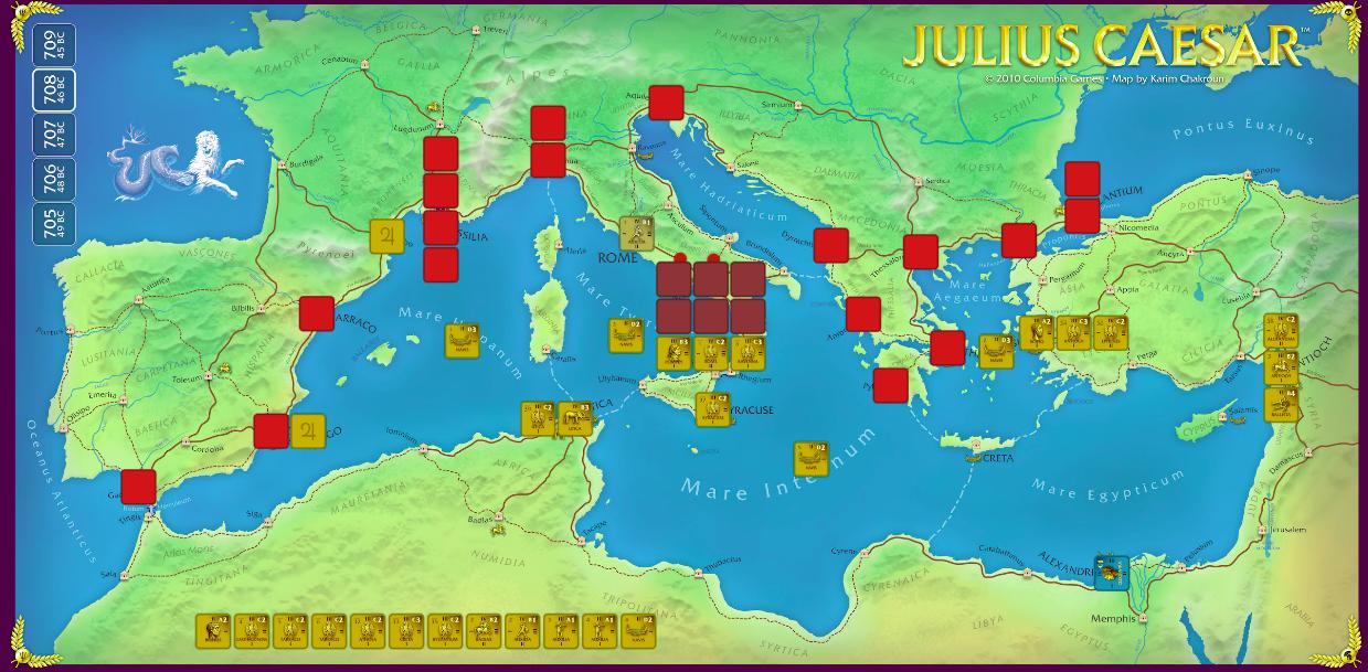 Another block game on Rally the Troops - Julius Caesar - covers the Roman Civil War between Julius Caesar (red blocks) and Pompey (light tan blocks). In this game, Caesar attacked Pompey with his army in south Italy near Neopolis with substantially greater forces. But Pompey's navy surprised Caesar by amphibiously landing a surprise attack on Rome itself successfully taking it, leaving Caesar without a retreat route if he happened to not be able to finish off Pompey in time. Caesar did manage to defeat Pompey's force completely just in time (if not done in 3 rounds, attacker has to retreat which he would not be able to do in this case), thereby both saving his force and taking out Pompey! That lone Pompey's auxillary unit in Rome did last for 6 months though..