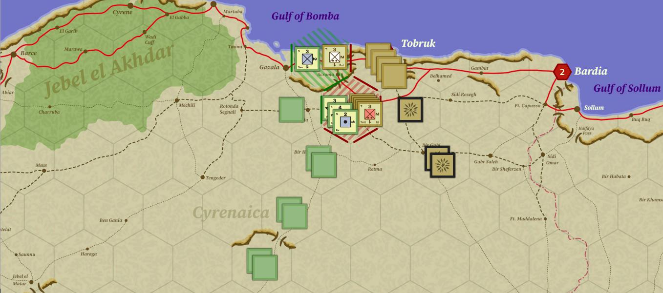 A block game on hex grid of WW II in North Africa with various scenarios. This is an observer's view of the 1941 scenario where the players are battling over Tobruk - Germans in green and British in brown. Blocks are revealed for a battle. I'm just learning this game but it seems to be a good look at the struggles the combatants had with juggling their available supplies with opportunities to take and hold ground.