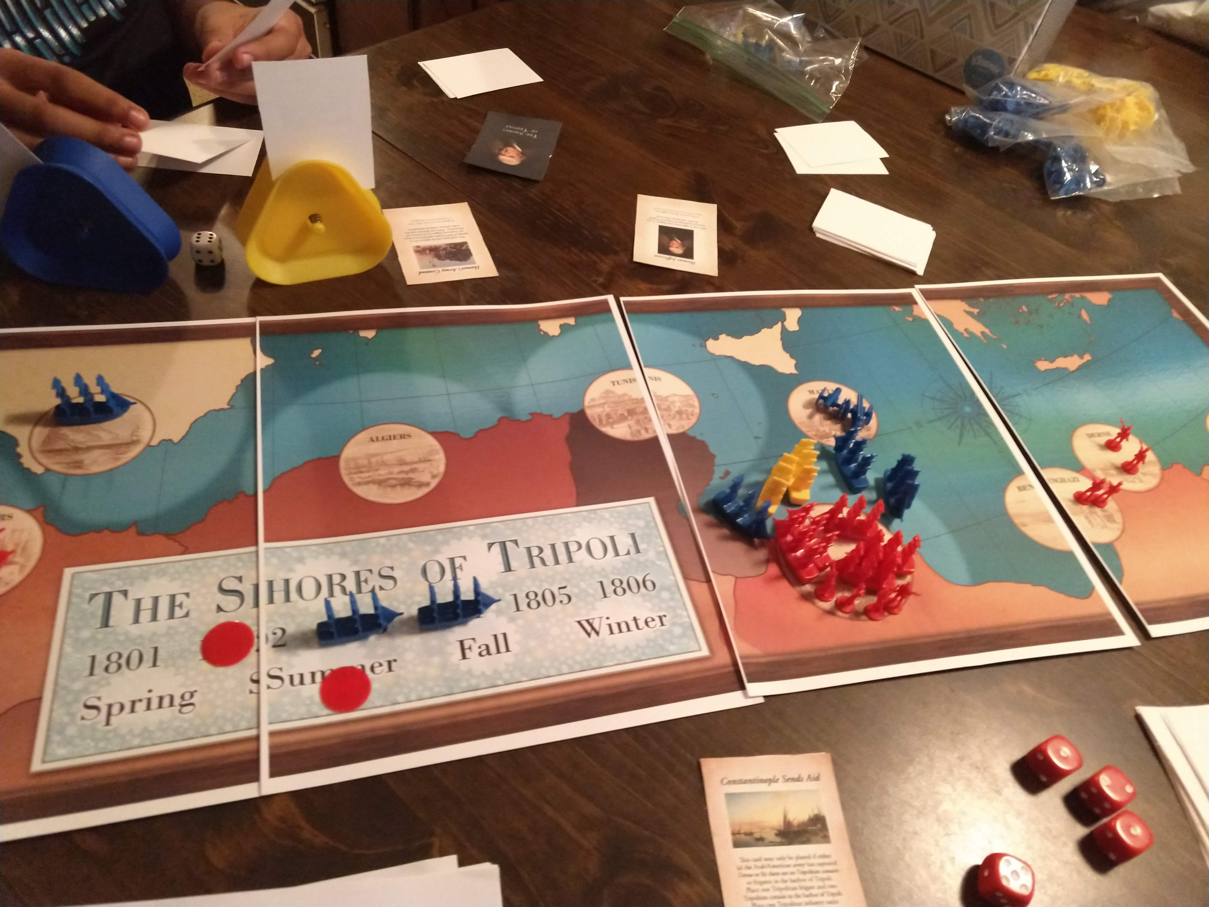 I just found these pics of a long ago time when I could talk my son into trying out some of these wargames with me (now he's too cool and much older and somewhere else now..). But we actually playtested a couple of games - Shores of Tripoli for Fort Circle Games (also Halls of Montezuma for them later but didn't find a pic), and Compass Games' WWII Commander Vol I - Battle of the Bulge. We always played lots of strategy games (with my daughter also) but wargames proper there were just a few others - Washington's War, Titan, as well as a few 'dudes on a map' type games like Axis and Allies, Viktory II, etc... Good times..