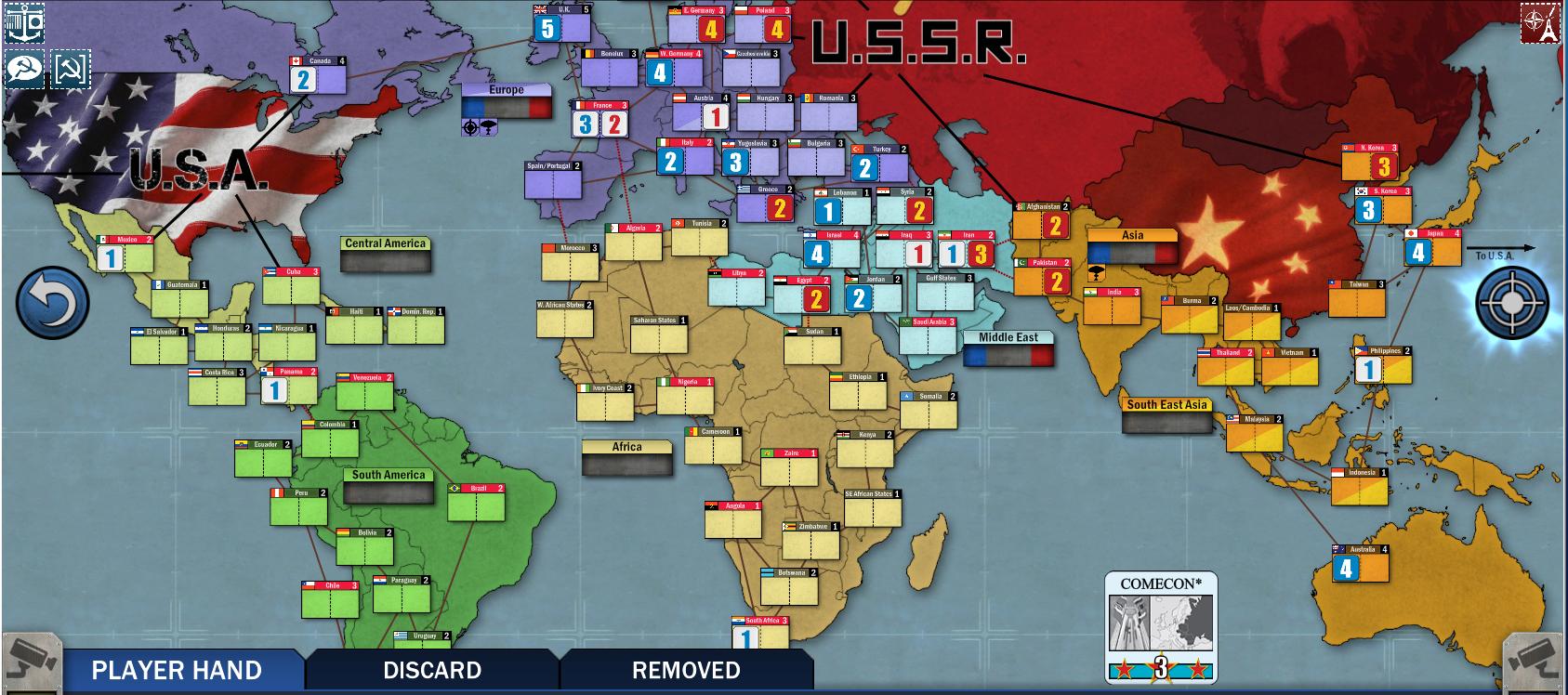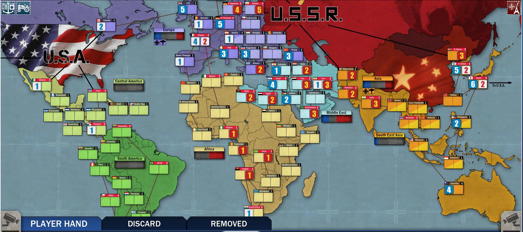 This is a two player game on the Cold War between the US and USSR. Interestingly although usually classified along more niche wargames, this was the number one game for a long time on I think the most popular boardgame site Boardgame Geek where wargames are just a small part of the game population. It is a card driven game played in three phases - early war turns, mid war turns, and late war turns. In the early war turns, the cards tend to be better for the USSR with the US often hanging on til cards get better for them later in the game. I've thought the cards are especially interesting for how they represent historical events of the Cold War. This game has a big following and international tourneys for both individuals and teams! So of course it does have a Vassal mod for it, but here I'm using the Steam version as it's just easier to play. The first pic is of the early game where as mentioned the USSR tends to get off on a better start - the US is holding on okay in Western Europe, Japan, Israel, etc but the USSR has gained in eastern Europe, North Korea and gained inroads in the Middle East and Indian subcontinent. A little later in the second pic, the US has extended influence in western Europe a little more and in the Philippines as well as maintained a foothold in South Africa, but the USSR has started spreading influence through Africa and taken India! This is a game I often lose but always enjoy playing - it features a Space Race, an actual China card either and often both sides end up playing, many coups, etc.