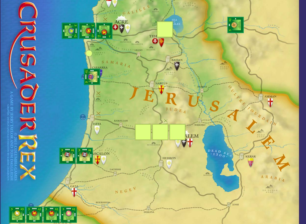 Another block game, this time about the crusades. Here the Saracens - green - were able to pull off a double attack thereby both taking Acre and cutting off the retreat path for the Crusader forces trying to retake Acre. Unable to either take Acre or retreat, Crusader forces suffered substantial losses.